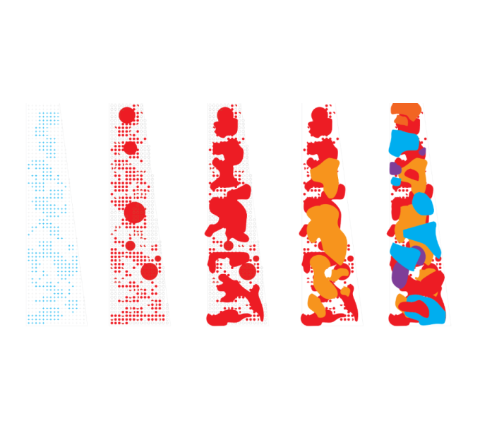 We first marked the space with a vivid blue wall to frame the garden’s ground breaking. Then, inspired by the Mexican tradition of sawdust carpets, we visualized this story by creating a temporary pattern on the ground of the garden as a canvas for movement.